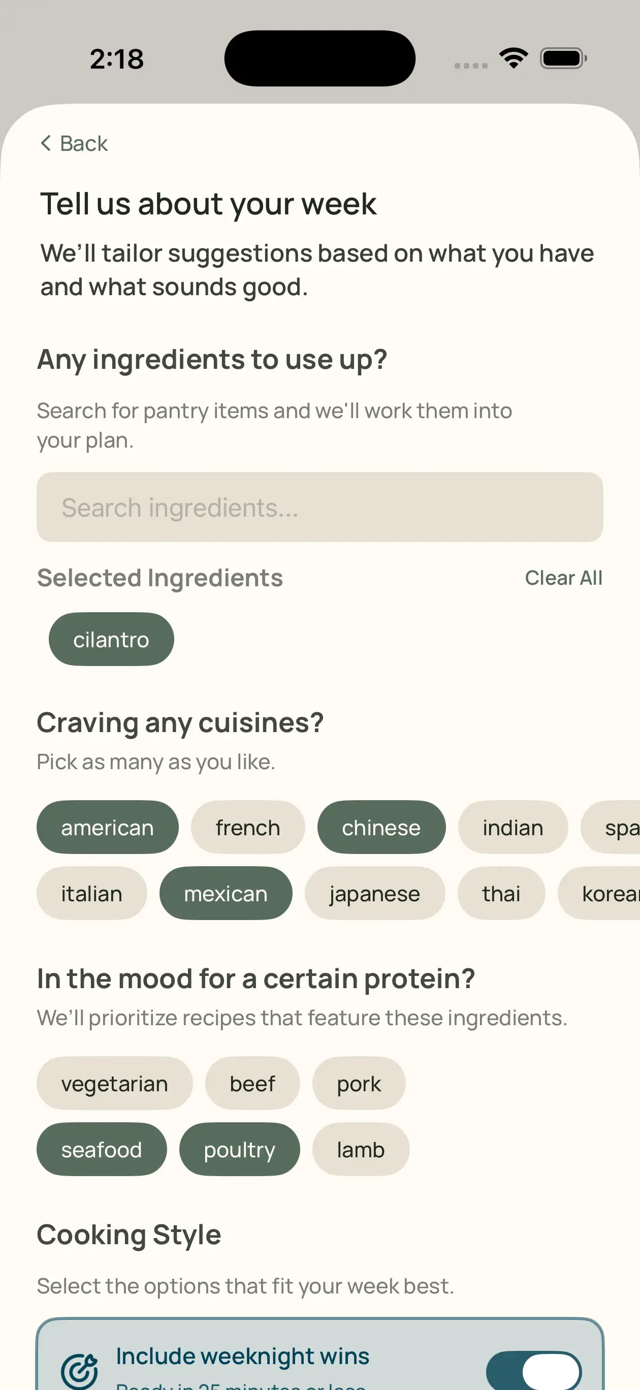 Share what you want to cook, what you want to use up, and how much time you have.